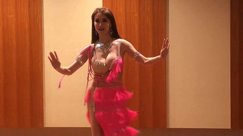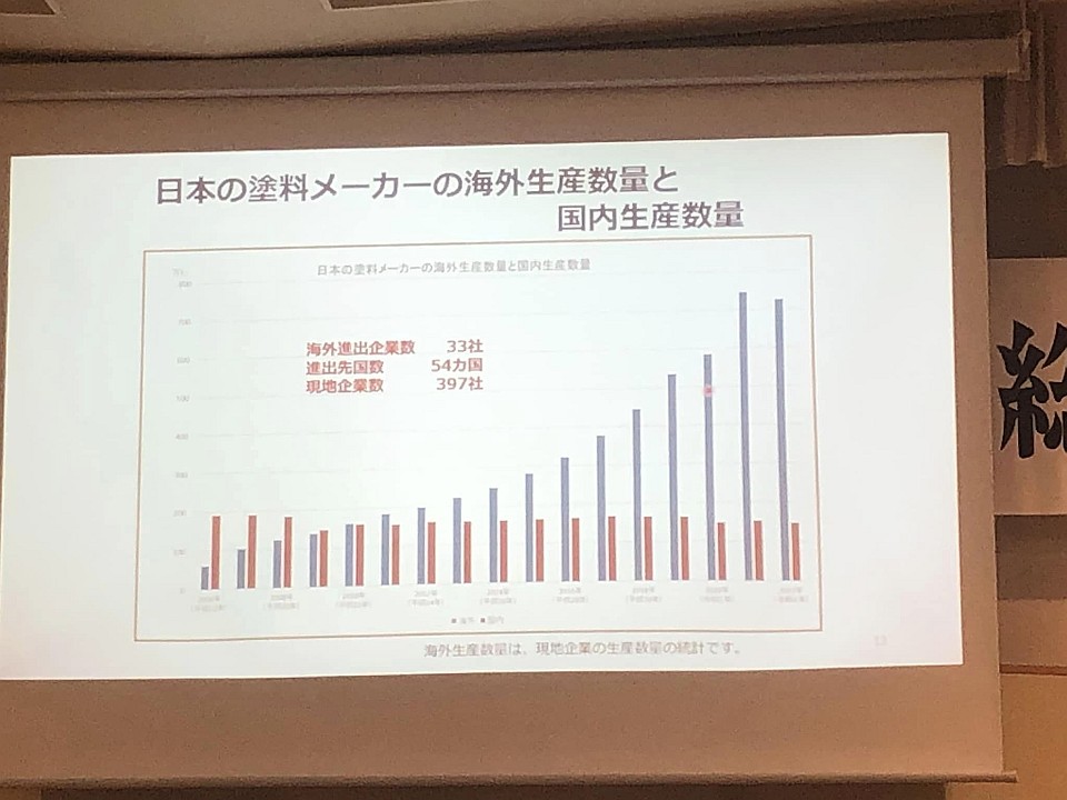 「塗料業界の動向」関西ペイント、「建設業界のこれから」大塚刷毛の2社による基調講演の後は、懇親会と進みます。美味しい料理と酒を飲みながら、ステージ上のベリーダンスを鑑賞。華やかですが、昨今話題になった「政治家の集まり」では無いので、お咎めは無いでしょう(笑)。和やかな雰囲気の中で塗料屋メンバー達、塗料メーカー出席者達と親睦をはかりました。
