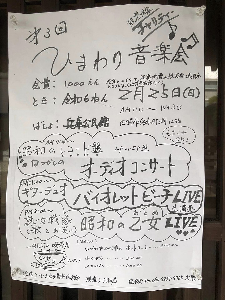今日は兵庫公民館であった、能登応援チャリティー「ひまわり音楽会」に行って来ました。会場ではたくさん置いてある昭和のレコードから、聞きたいのを選んでリクエストできて良かった。2時間の間、みっちり楽しみました。