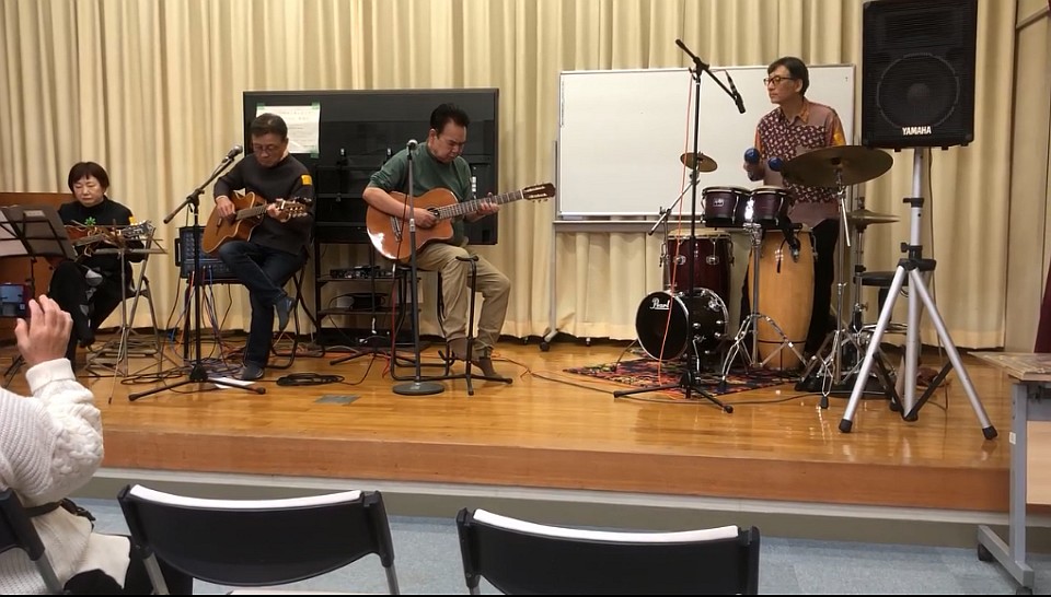 ステージでは、地元ミュージシャン「バイオレットビーチ」の4人による生演奏があり、映画音楽、ラテンなどを聴かせてもらいました。それから、熟女戦隊「昭和の乙女」の歌とダンスも楽しかった。