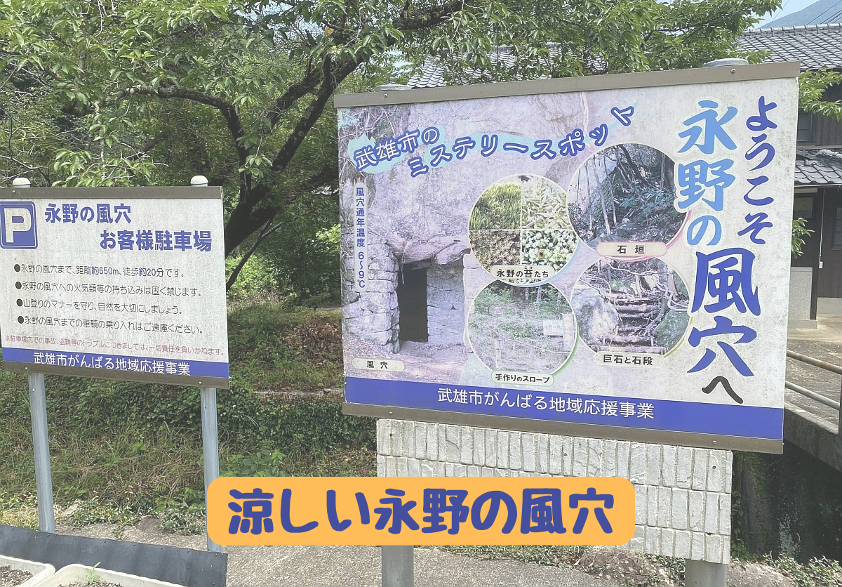 殺人的な昼間の暑さが続く毎日。Nさんから聞いた永野の風穴(かざあな)に行ってみることにしました。多久に入り女山トンネルを抜けて、武雄の若木へ。さらに右側に登って、駐車場から15分登ると永野の風穴へ到着。
